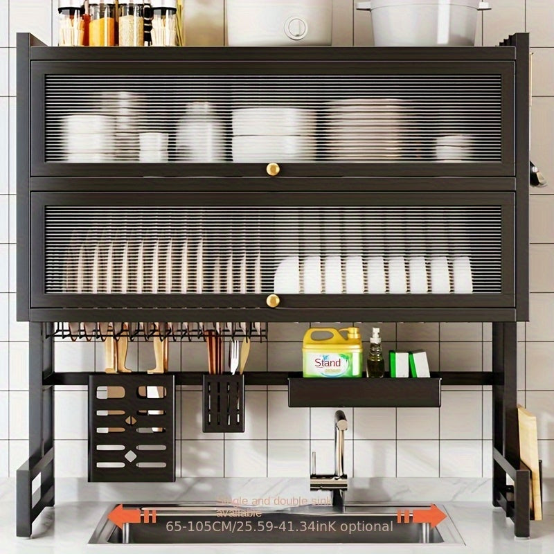 Organizador multifuncional para fregadero de cocina - Estructura de acero al carbono/metal con altura ajustable (21.21 cm-30.0 cm), ahorrador de espacio con ganchos, canastas y soporte para tabla de cortar, ideal para mesón, gabinete, utensilios y platos