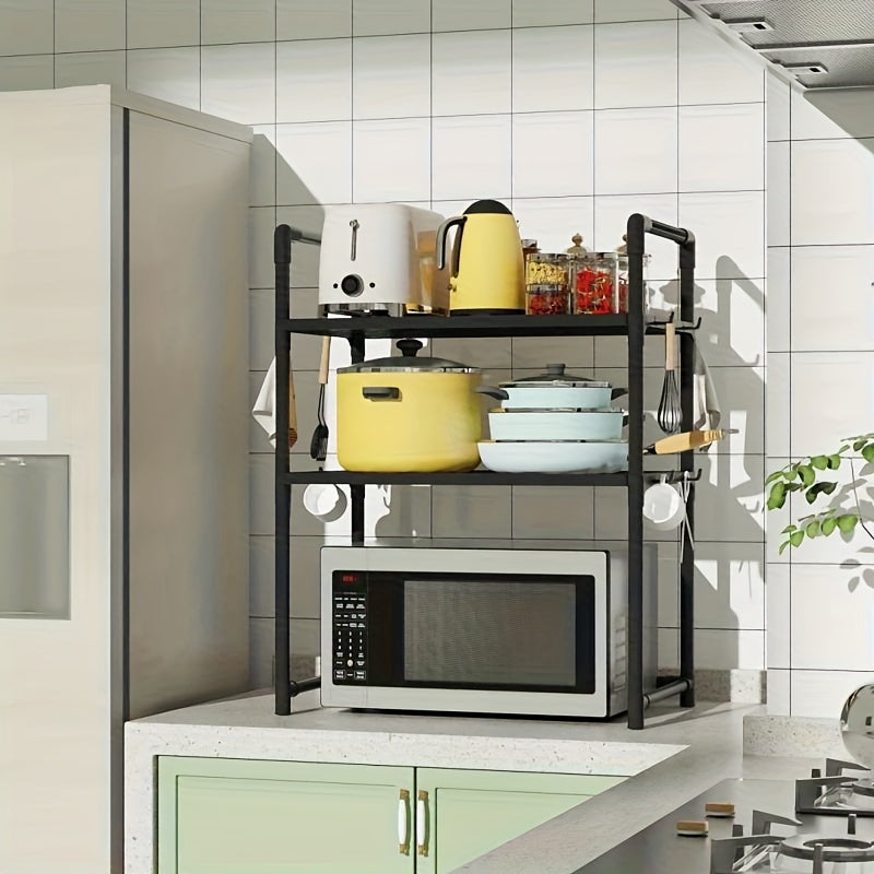 Un estante de almacenamiento de cocina con asas, ideal para hornos microondas y tostadores, incluye ganchos laterales para toallas, resistente y duradero, perfecto para uso doméstico.