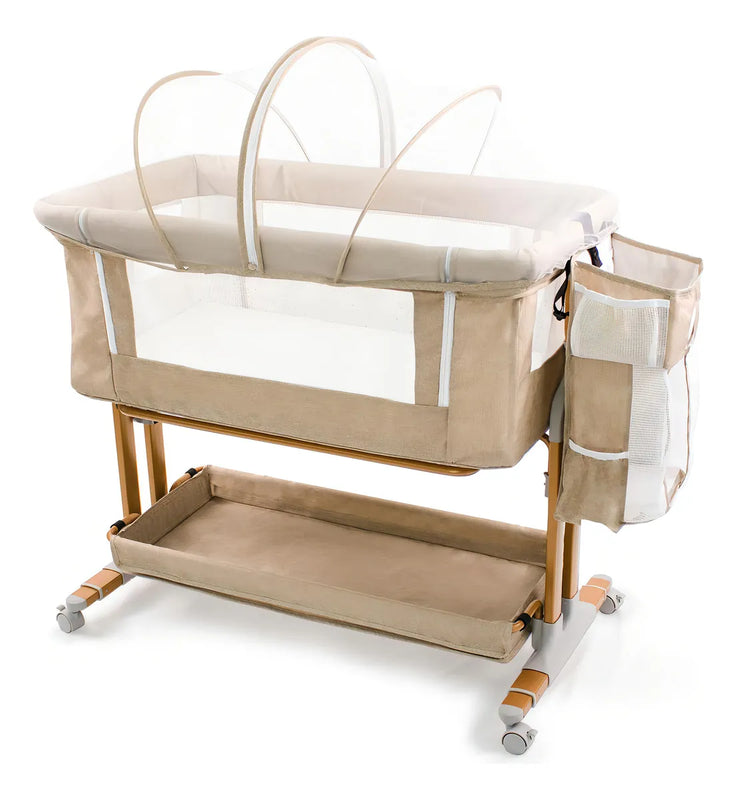 Elige el moisés BICYSTAR con marco de metal de color dorado, diseñado para el cuidado del bebé junto a la cama.