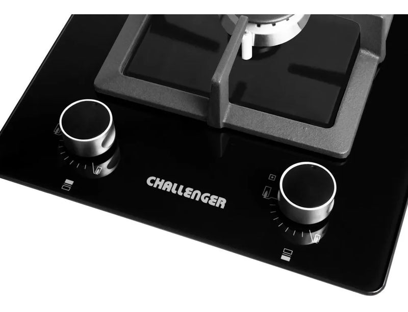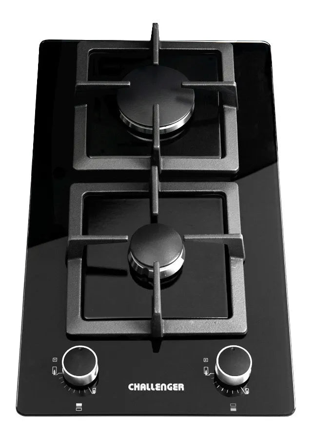Estufa de Empotrar de 2 Puestos Challenger en Vidrio Templado de 52x30 cm, alimentación a Gas Natural con posibilidad de cambio a Gas Propano (GLP); Quemadores italianos SABAF de alta eficiencia que reducen tiempos de cocción y ahorran gas entre un 5% y 15% comparado con quemadores serie II. Cubierta en vidrio templado de seguridad con bordes rectos y cantos redondeados.