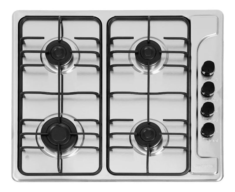 Estufa de Empotrar a Gas 4 Puestos Challenger en Acero Inoxidable de 59x51 cm, diseñada para funcionar con Gas Natural y con posibilidad de conversión a Gas Propano (GLP). Equipada con Quemadores italianos SABAF de alta eficiencia que optimizan el consumo de gas y reducen los tiempos de cocción.