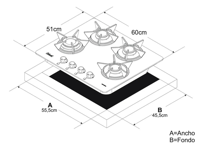 Dispone de 4 quemadores, distribuidos en 3 semi-rápidos y 1 rápido ubicado en la parte trasera, ideal para cocciones más rápidas y ollas grandes. Como estufa empotrable, es importante revisar las medidas del producto antes de la instalación.