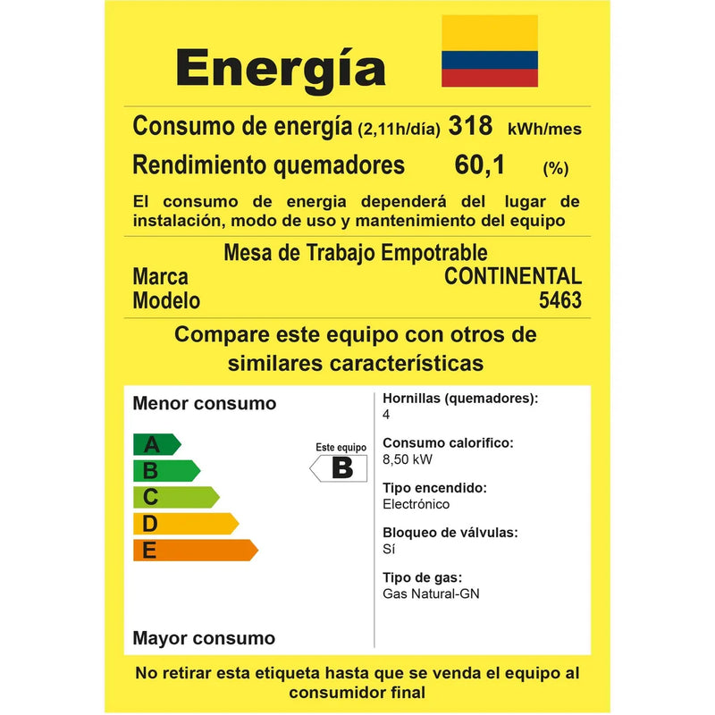 Esta estufa empotrable cuenta con un diseño de área antiderrame en la cubierta, lo que evita que líquidos o residuos ensucien tu mueble. Su consumo tipo B también es un beneficio, ya que ayuda a optimizar el uso del gas natural sin comprometer el rendimiento. Tiene 4 quemadores: tres semi-rápidos y uno rápido, lo que te permite cocinar a diferentes temperaturas según tus necesidades. Además, su estructura robusta garantiza una larga vida útil en todo tipo de ambientes de cocina.