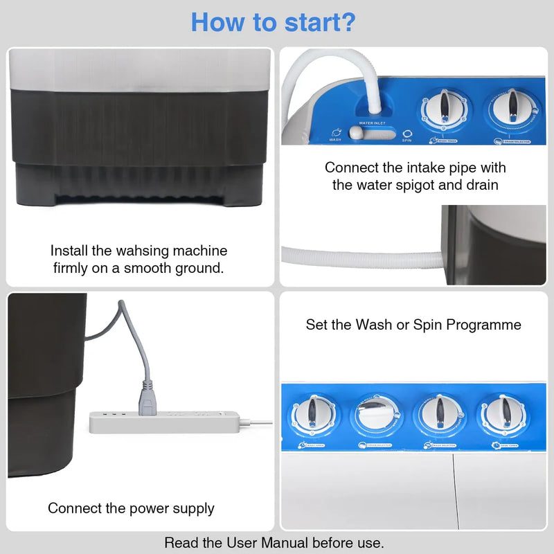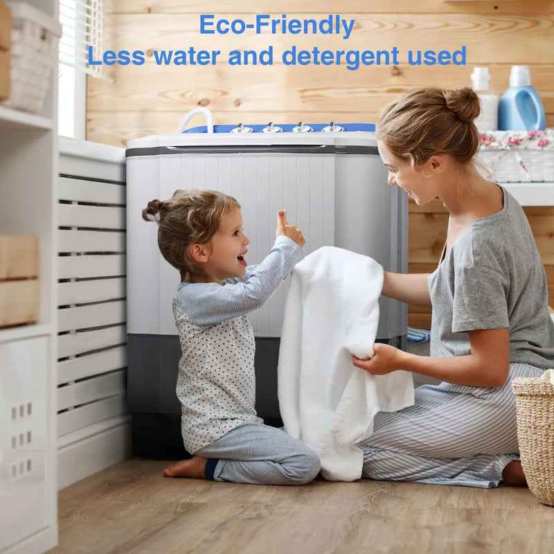 ,-Diseno compacto de lavado de doble tina: la lavadora portatil cuenta con baneras separadas de lavado y secado por centrifugado, con un diseno compacto que es conveniente de operar, lo que le ahorra mucho tiempo y elimina la necesidad de ir a una lavanderia o lavar la ropa a mano en una banera.