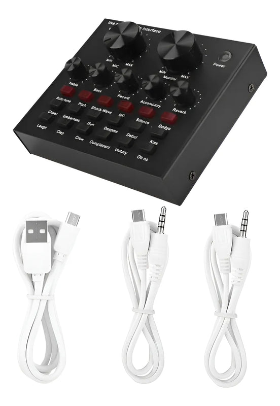 V8 - Tarjeta de sonido en vivo para transmisión en vivo, cambiador de voz con 18 tipos de efectos, mezclador de audio Bluetooth para computadora, laptop, teléfono transmisión en vivo tarjeta de cambio.
