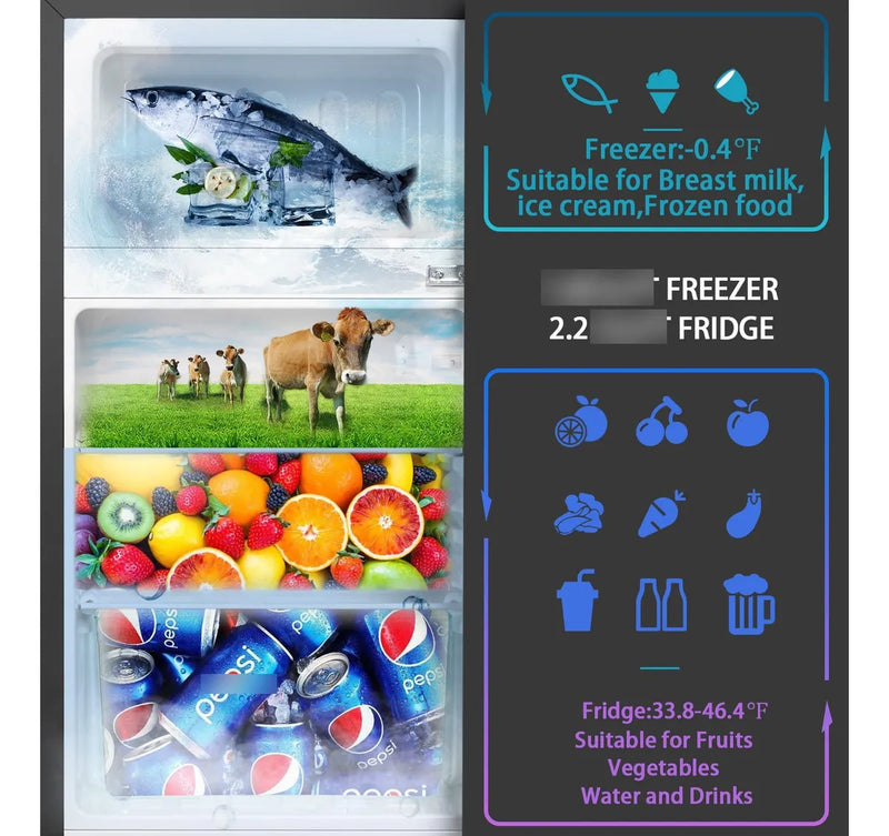 Temperatura ajustable: la temperatura interna del refrigerador varía de 32 F a 50 F y las temperaturas del congelador varían de 11.2 F a 5 F termostato ajustable y enfriamiento del compresor para un rendimiento máximo incluso en climas cálidos