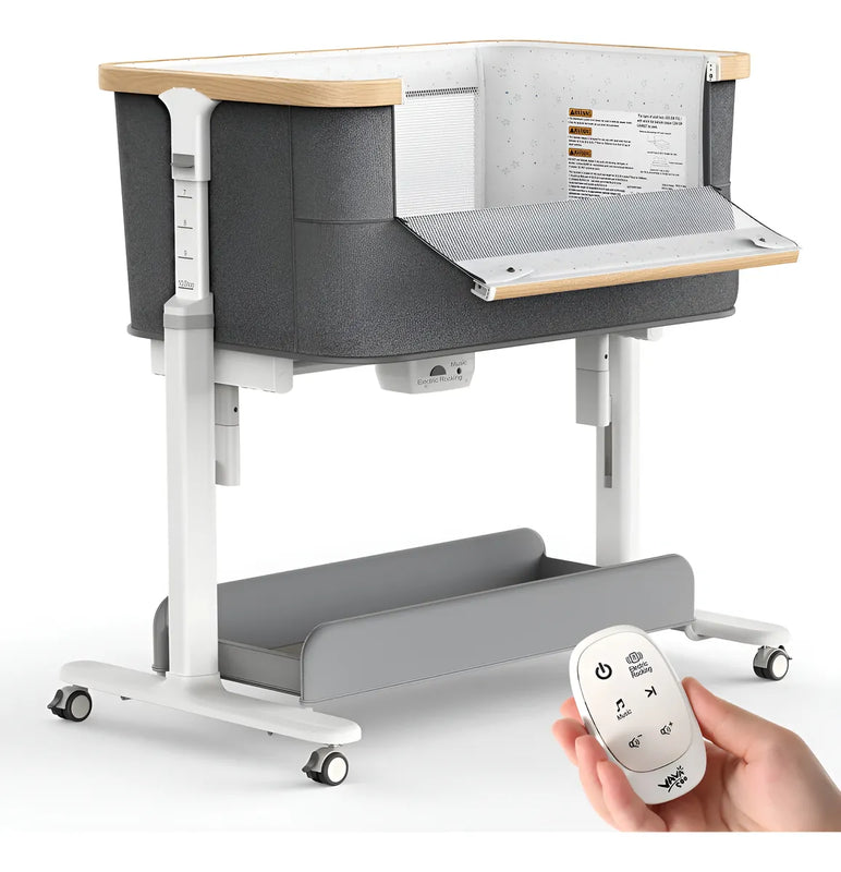 Moisés mecedor para bebé, eléctrico, automático, para dormir, 3 movimientos, auto rodante para recién nacido, 5 alturas ajustables con música, ruedas, almacenamiento, gris oscuro
