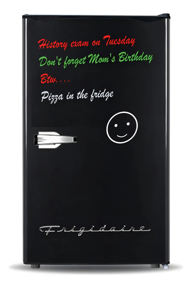 El Frigidaire Retro Borrador de la Junta de Refrigerador le dará el espacio de almacenamiento extra que necesita para su alimentación y bebidas. Tiene una composición única que permite escribir y borrar mensajes en la parte frontal, lo que le permite personalizarlo de una manera divertida.