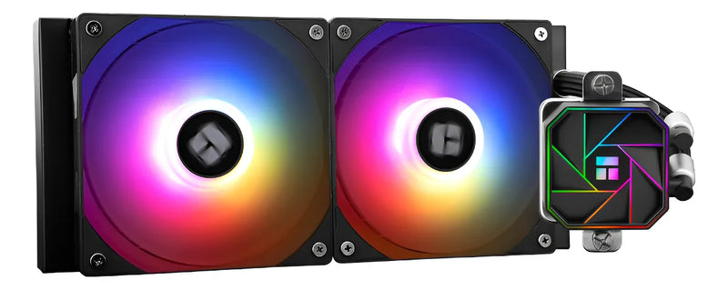 Sistema de enfriamiento líquido con dos ventiladores de 120 mm para un total de 240 mm en disipación de calor, sus ventiladores y bomba con conexión PWM se ajustan automáticamente según la temperatura de la CPU, proporcionando un mejor flujo de aire y un menor ruido, además, los ventiladores están equipados con cojinetes S-FDB V2 de alta absorción para un funcionamiento silencioso y una más larga vida útil. Sus aspas tienen un diseño especial de alta presión estática optimizado su uso sobre radiadores. El cabezal está equipado con una placa en cobre de alta calidad para una disipación de calor más eficiente y una cobertura en acrílico altamente resistente con un diseño exclusivo en espiral e iluminación ARGB.