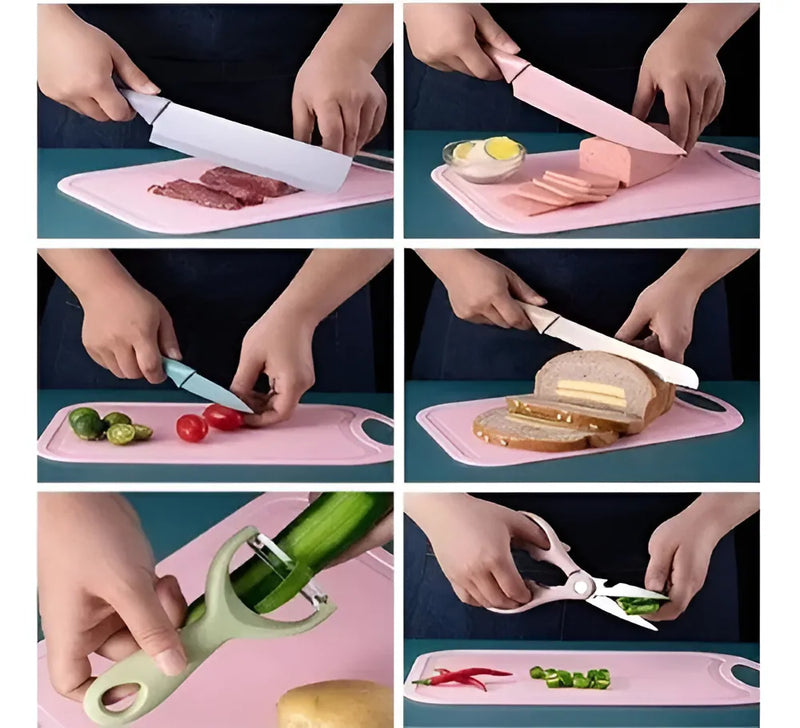 Un completo set de cuchillos de cocina que además de su presentación elegante facilitaran la preparación de tus alimentos, cada cuchillo tiene un uso en particular y esto evita que se mezclen los sabores de la comida, como cuando usas el mismo cuchillo para cortar cebolla y luego frutas; ahora podrás pelar, picar, trocear de una manera más práctica y también eficiente.