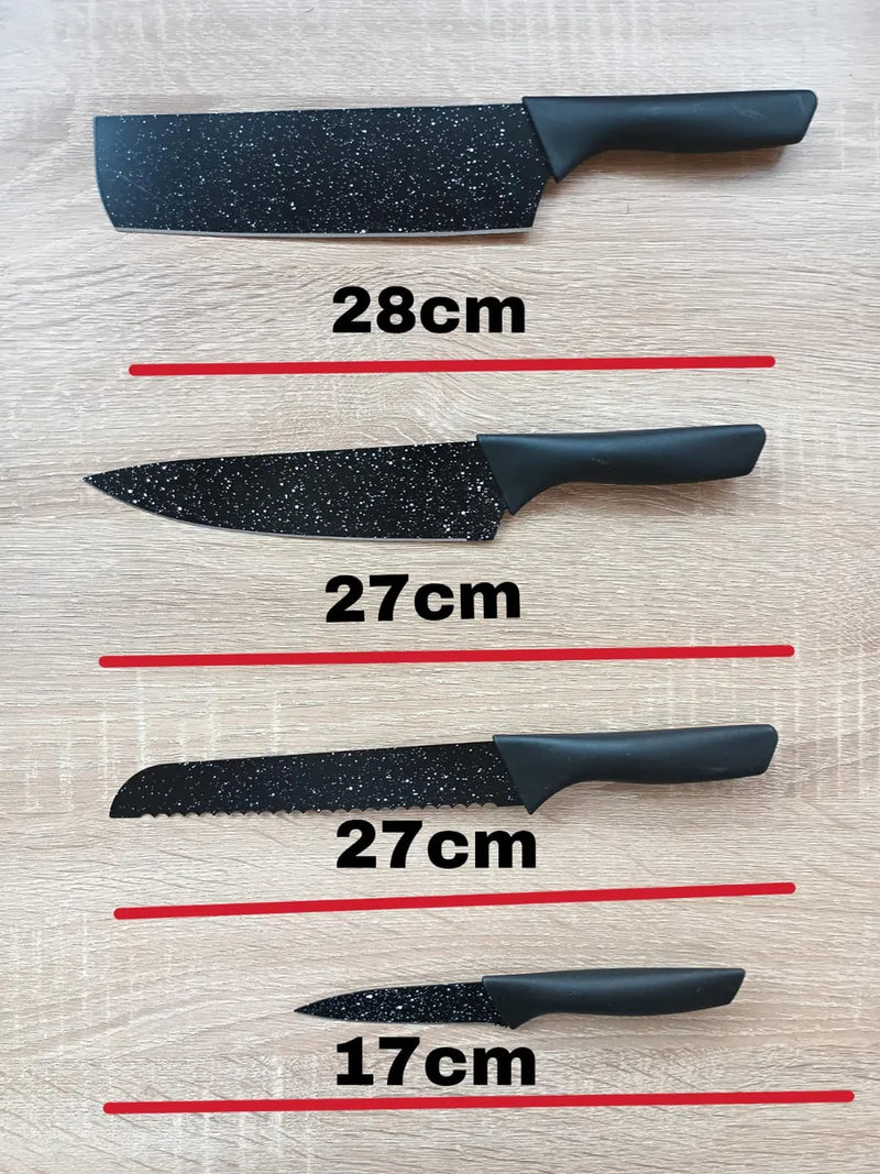 Un completo set de cuchillos de cocina que además de su presentación elegante facilitaran la preparación de tus alimentos, cada cuchillo tiene un uso en particular y esto evita que se mezclen los sabores de la comida, como cuando usas el mismo cuchillo para cortar cebolla y luego frutas; ahora podrás pelar, picar, trocear de una manera más práctica y también eficiente.