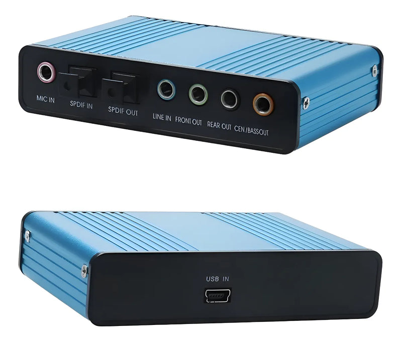 Tarjeta de sonido externa USB 2.0 a 32 kbz. 4 y 4.1 kHz para conectar parlantes 5.1 al pc. y escuchar todos sus efectos cuando son compatibles con 5.1.