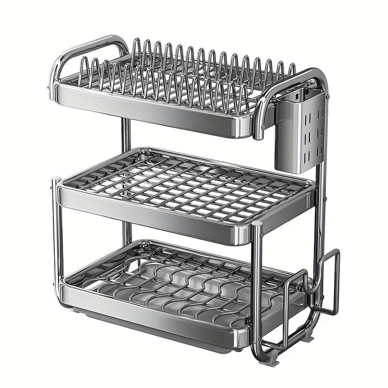 1 juego de escurridor de platos de acero inoxidable 201 grande, con 2 o 3 niveles, soporte para tazas, organizador de utensilios y repisa para escurrir, color plateado, para mesón de cocina