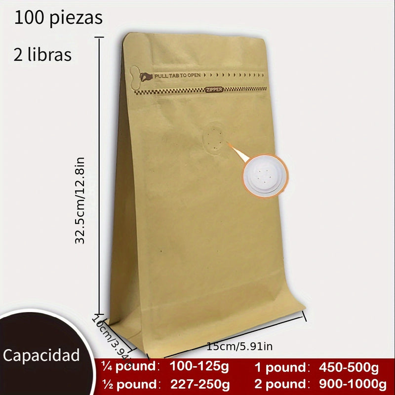 100 piezas Bolsa de Café Kraft con Válvula Unidireccional y Sellado Automático para Granos de Café, Frutos Secos y Semillas, Hojas de Té