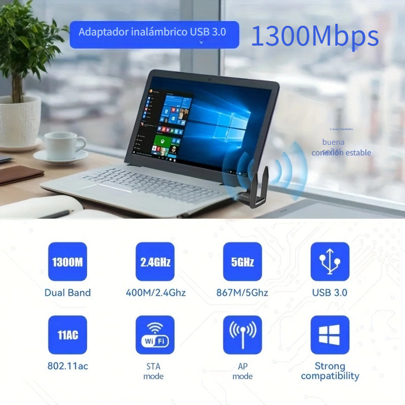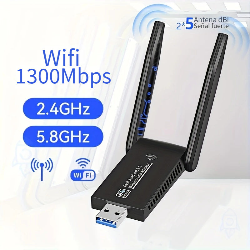 Adaptador USB WiFi de doble banda WIMOTEK de 1300 Mbps con antenas de 5 dBi, 802.11AC, USB 3.0, compatible con Windows 11/10/8/7/XP, Mac OS 10.9-10.15, conectividad Wi-Fi confiable para PC de escritorio