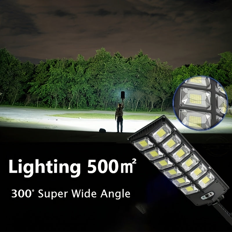 1 lámpara de calle solar, 504×6500K LEDs con lente. Luz automática de puesta de sol a amanecer alimentada por energía solar para estacionamientos; sensor de movimiento de ángulo amplio y farola controlada a distancia. Ideal para iluminación comercial/cor