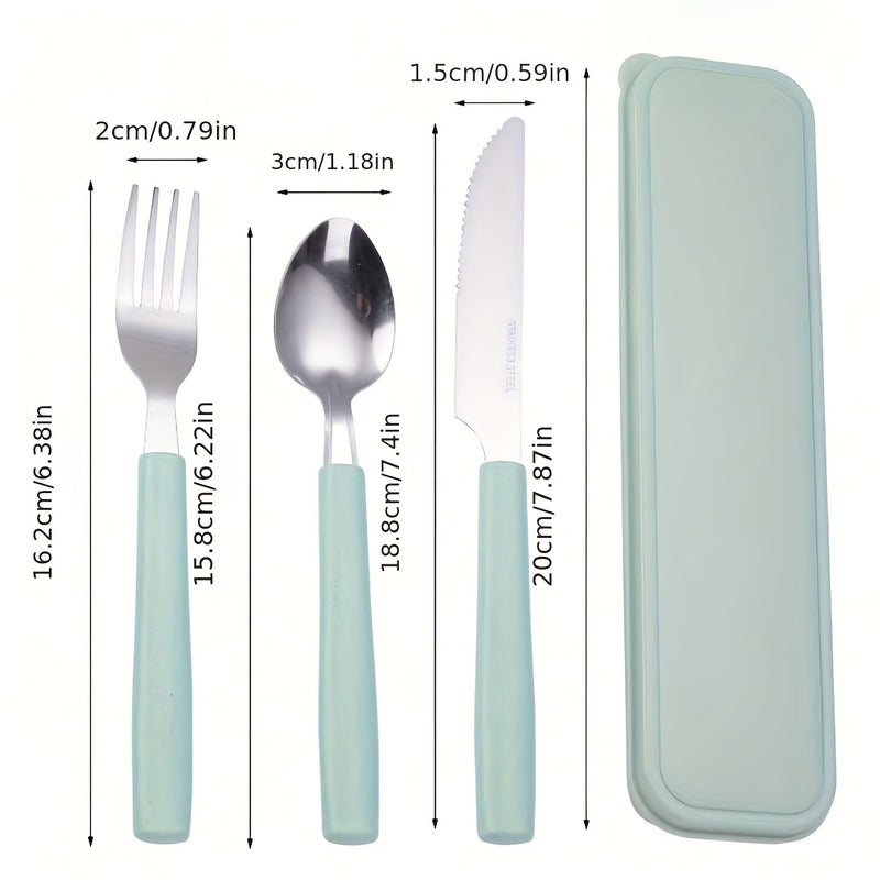 3 piezas de juego de cubiertos de viaje portátil de acero inoxidable, incluyendo cuchillo, tenedor, cuchara - Perfecto para oficina, escuela, picnic, camping y actividades al aire libre - Más adecuado para estudiantes y amigos pequeños con almacenamiento
