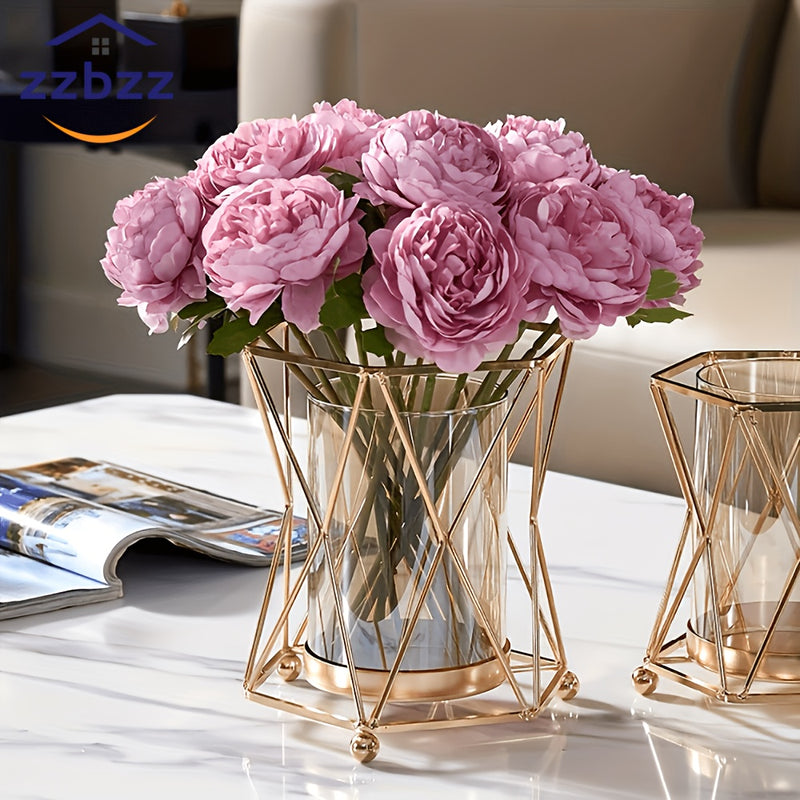 1 pieza de Jarrón Metálico Dorado y Plástico Transparente ZZBZZ - Decoración Elegante Moderna para Sala de Estar, Centro de Mesa de Comedor, Portavelas, Sin Batería, Ambientador Romántico | Diseño Lujoso | Acabado Electrolítico