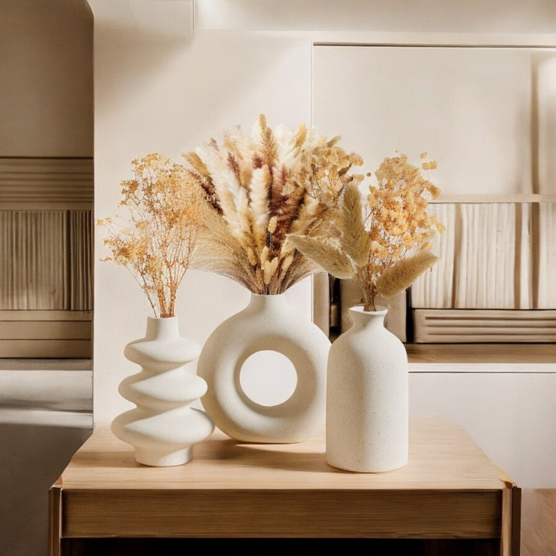 Conjunto de 3 jarrones de cerámica boho, forma oblonga, blanco, trío de jarrones decorativos para decoración del hogar y centros de mesa con flores secas y hierba persa.