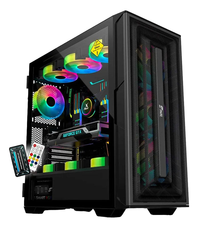 Chasis Ultimate Gamer PRO edición War Hammer, compatible con placa E-ATX / ATX / Micro-ATX / ITX, material de alta calidad, lateral en vidrio templado para una mejor disipación de calor, lamina black coating de alto calibre, incluye 7 cooler con tecnología ARGB instalados, controladora y control remoto para ajustar la velocidad, intensidad, color o efecto de iluminación de los cooler (+ 100 modos de luz) puertos USB 3.0, tarjeta de audio integrada para disfrutar de sonido HD.