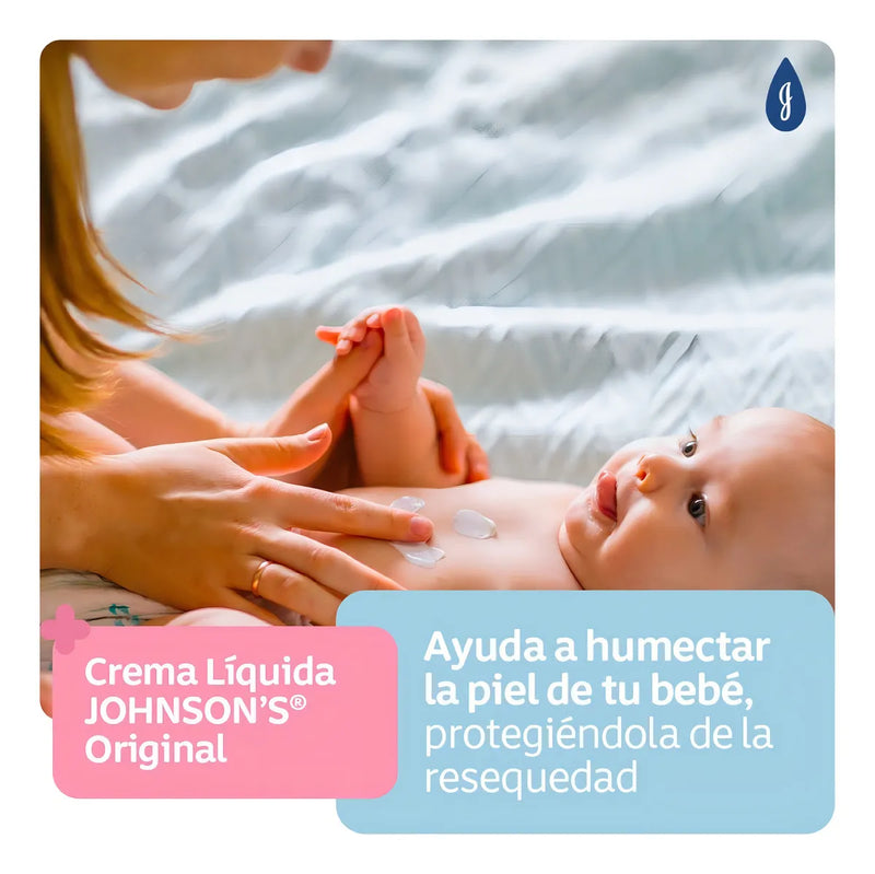 Crema Líquida Johnson’s original contiene glicerina vegetal y aceite de coco* que ayudan a humectar la piel del bebé hasta por 24 horas y a protegerla de la resequedad.