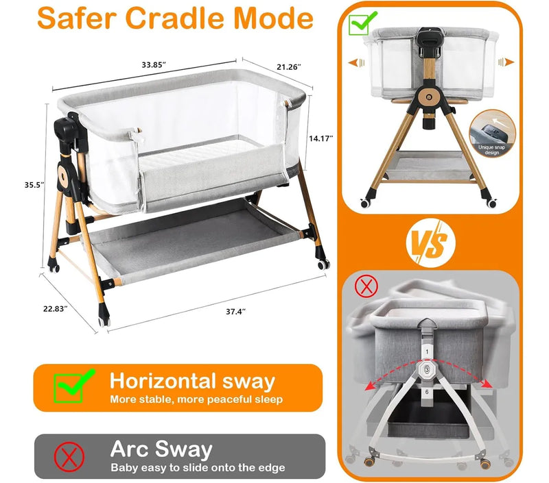 Diseño 3 en 1 que combina cuna lateral, cuna mecedora y cuna independiente, optimizando espacio y recursos.