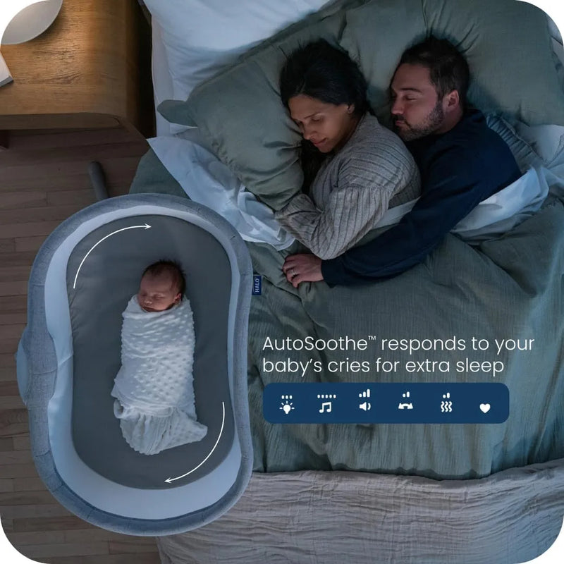 HALO BassiNest Conectado Cuna Giratoria 3.0 – Cuna Inteligente con AutoSoothe™, Giro 360°, Detección de Llanto, Balanceo, Vibración y Sonidos Relajantes, Muro Rebatible para Recuperación Postparto