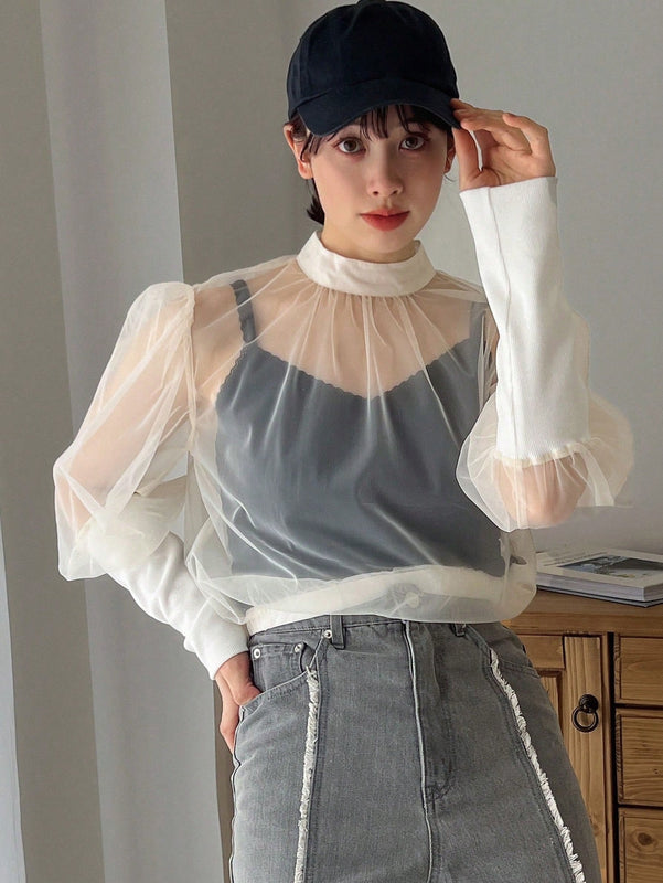 FRIFUL Blusa De Malla Transparente Con Mangas Abullonadas Y Cuello Alto Para Mujer