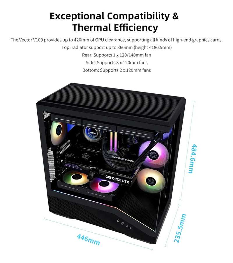 Capacidad para placas madre ATX y Micro-ATX, y soporta tarjetas gráficas de alto rendimiento de hasta 420 mm de longitud.