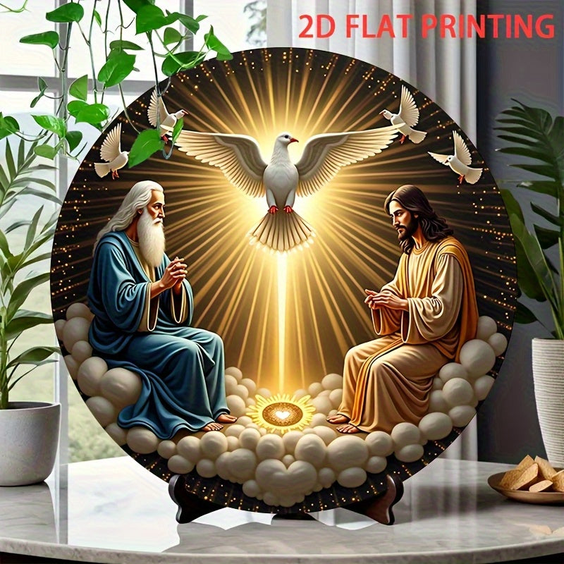 Letrero de Pared Artificial Redondo de Madera 2D, 8 Pulgadas - Sagrada Trinidad con Paloma y Ángeles, Diseño Religioso Estilo Clásico Americano, Decoración para Interior/Exterior, Fácil Colgado en Puerta, Arte Espiritual Duradero para Hogar, Oficina o Bar