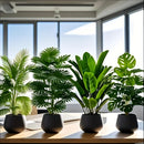 Juego de 4 piezas, incluye combinación de plantas artificiales de hojas grandes. Ideal para exteriores—árbol decorativo tropical de hoja ancha, macetas para interior y exterior todo el año, bodas, hoteles, jardines, patios estilo nórdico, árboles falsos