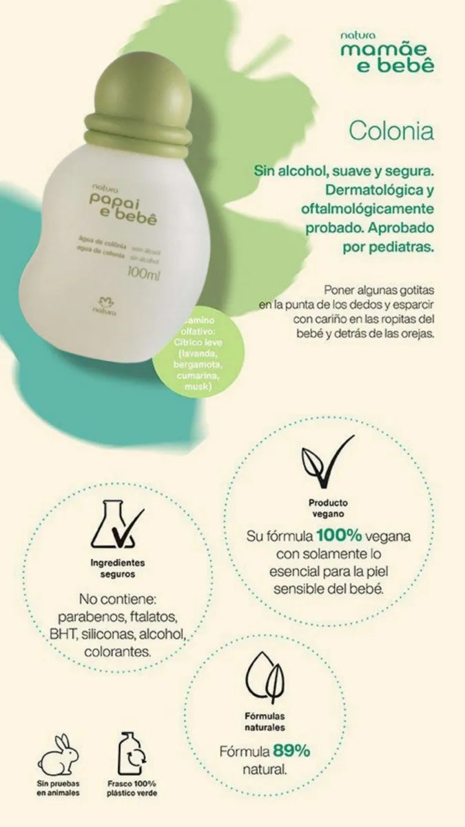 La Colonia Papá y Bebé aporta calidez y cuidado en una fragancia ligeramente cítrica, que combina suaves flores de lavanda con notas ligeramente dulces. Aroma suave y sin alcohol.