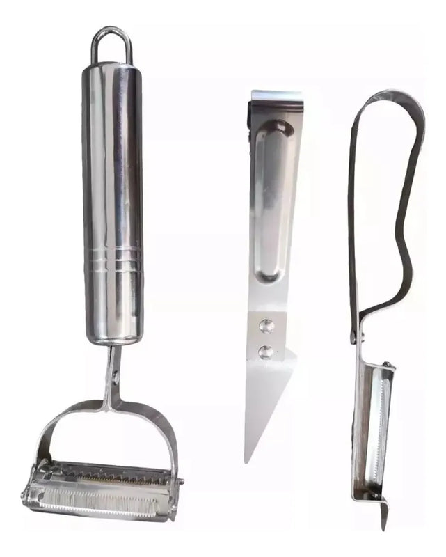 Juegos de peladores de cocina acero inoxidable Set X 3, con cuchillas en hoja giratoria. Fácil de limpiar y manipular. Gracias al material del que está hecho es mucho más higiénico y saludable para la preparación de tus alimentos.