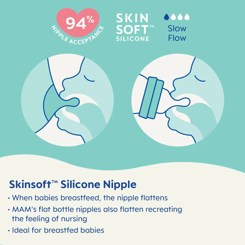 94 de aceptación del pezón: con una tetina suave SkinSoft, los biberones MAM recién nacidos son aceptados por el 94 de los bebés, lo que facilita el cambio entre la lactancia materna y la alimentación con biberón.