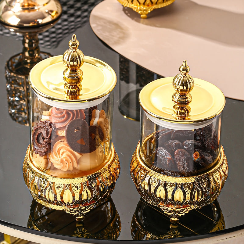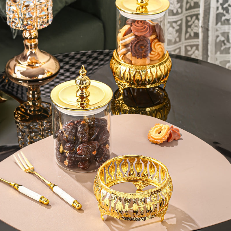 1pc Tarro de vidrio sellado hecho a mano con marco de acero inoxidable dorado, recipiente de almacenamiento de cocina para suministros de té, azúcar, caramelos, galletas, pan, ideal para bodas, regalo, cumpleaños, Navidad