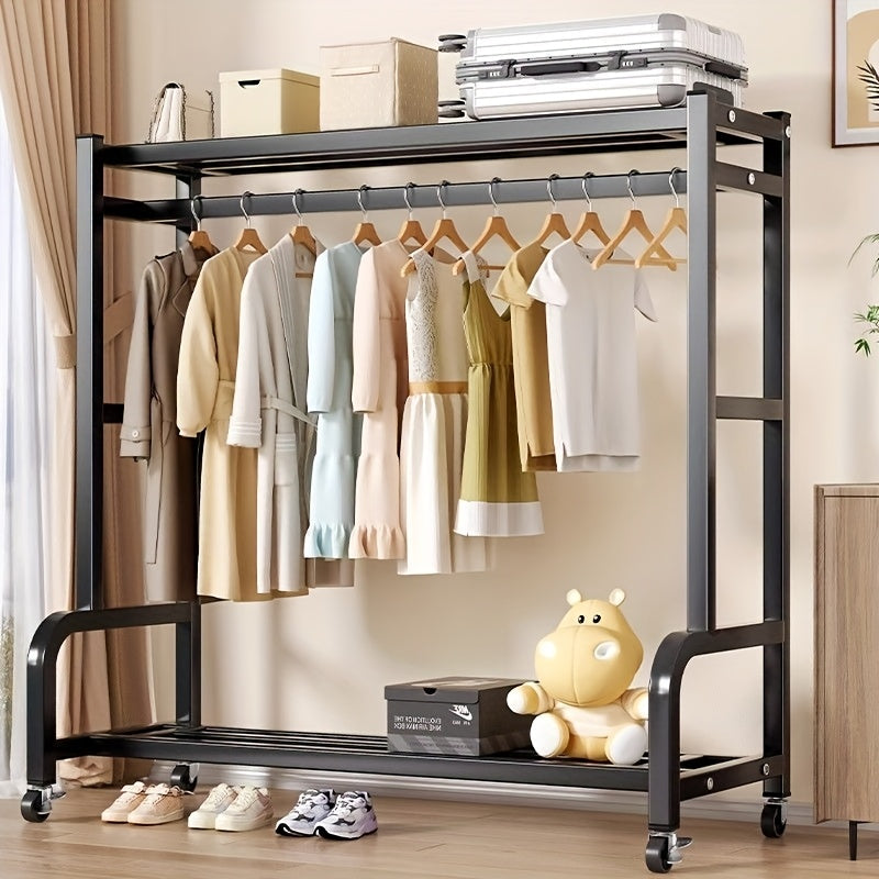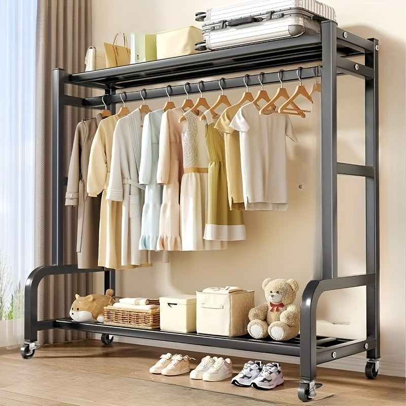 Perchero de Metal de Doble Barra con Cesta de Almacenamiento, Estantes y Ganchos - Organizador Portátil de Ropa, Fácil Montaje, Altura Ajustable, Diseño Ahorrador de Espacio para Dormitorio, Armario, Sala, Secado de Ropa