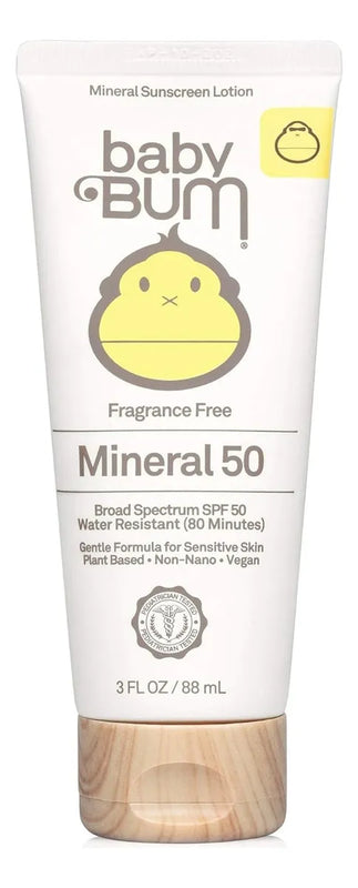 BABY BUM SPF 50 LOCIÓN DE PROTECTOR SOLAR. Nuestro práctico protector solar de tamaño de viaje es 100% de protección a base de minerales para tus pequeños. La loción se aplica y se absorbe fácilmente en la cara y el cuerpo con una sensación no grasa para protección UVA/UVB.
