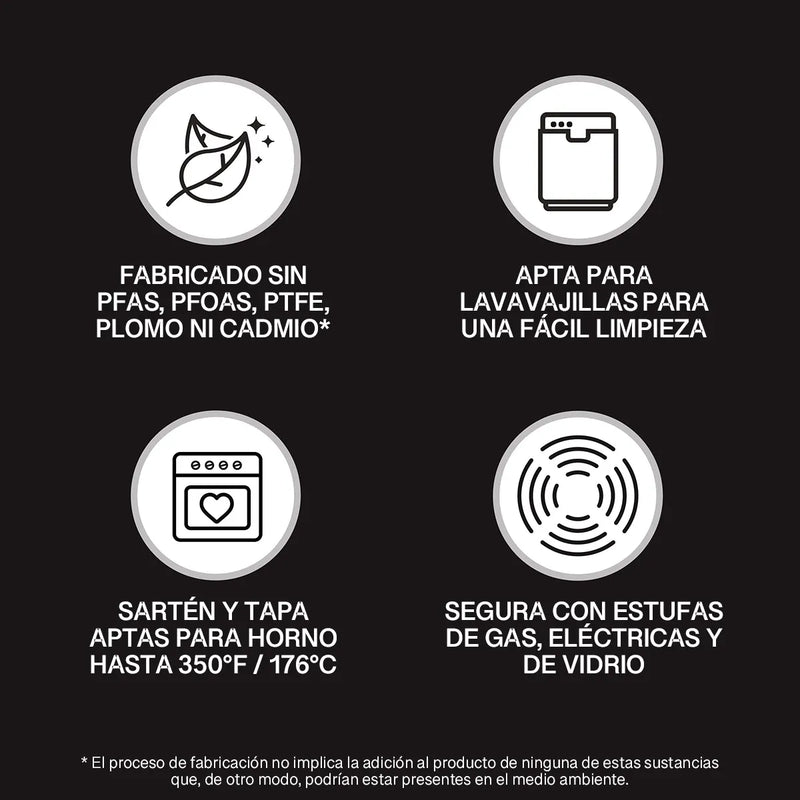 ANTIADHERENTE CERÁMICO para preparar tus alimentos de forma segura y saludable gracias al antiadherente cerámico no tóxico, fabricada sin PFAS, PFOA, PTFE, plomo ni cadmio, por lo que es segura para cocinar. El proceso de fabricación no implica la adición al producto de ninguna de estas sustancias, que de otro modo podrían estar presentes en el medio ambiente.