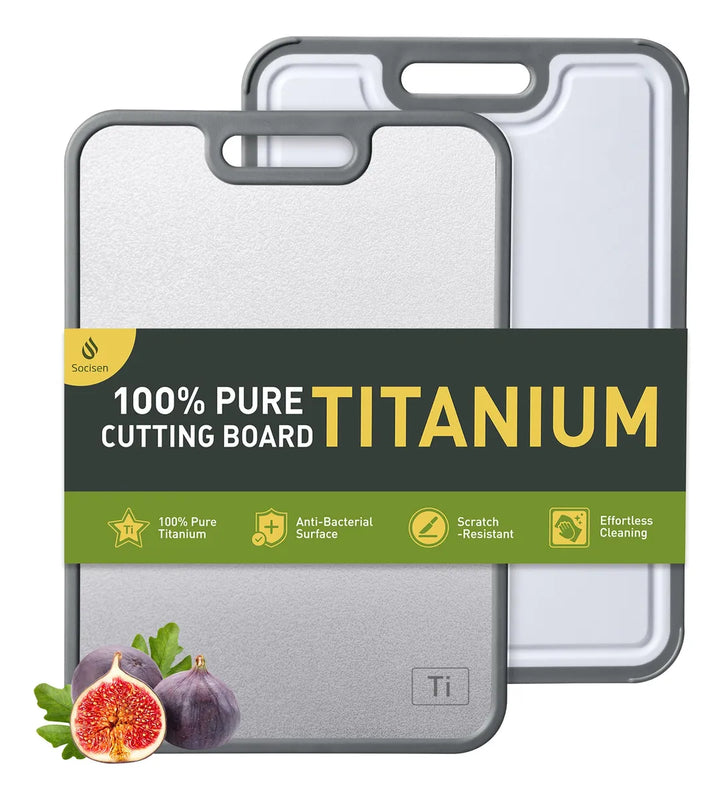 -Corte de titanio de doble cara para un uso versatil: las tablas de cortar de titanio Socisen para cocina cuentan con un lado de titanio 100% puro de grado alimenticio para cortar carnes y un lado de polipropileno para frutas y verduras. Este diseno de doble cara garantiza la seguridad alimentaria y la versatilidad, lo que te permite manejar diferentes ingredientes de manera eficiente. Perfecta para la cocina diaria, esta tabla de cortar proporciona una solucion de corte duradera y practica para tus necesidades de cocina.