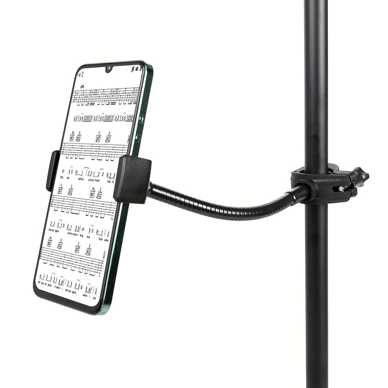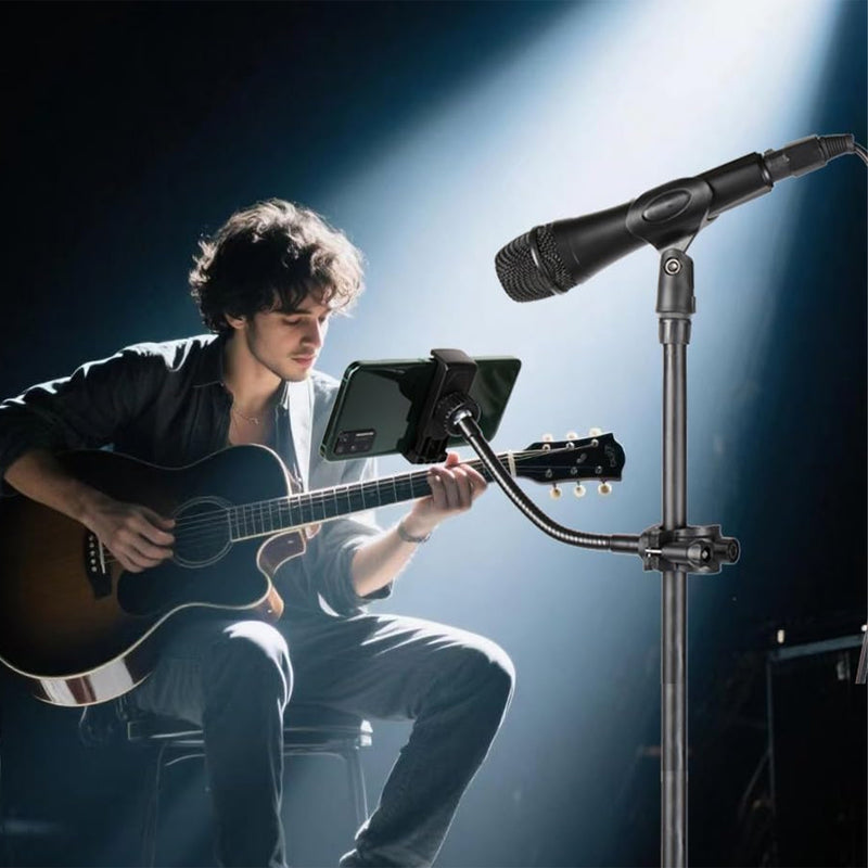 Un soporte para teléfono móvil para micrófono, hecho de material PP; la cabeza de bola metálica puede rotar 360°, con un cuello flexible que se puede ajustar a cualquier ángulo; el abrazadera en forma de O es más estable y más ajustado; dos colectores de