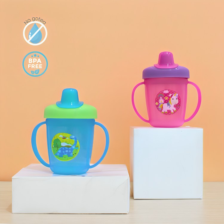 Este hermoso vaso entrenador 7 Onzas que te ofrecemos, está diseñado para que tu Bebe pueda beber fácilmente sin que los alimentos sean derramados, cuenta con un sistema antiderrame que asegura posibles fugas del líquido, su boquilla es dura compuesta de 3 orificios que permiten controlar los fluidos, además cuenta con 2  asas que permiten al bebé agarrarse e independizarse con facilidad.