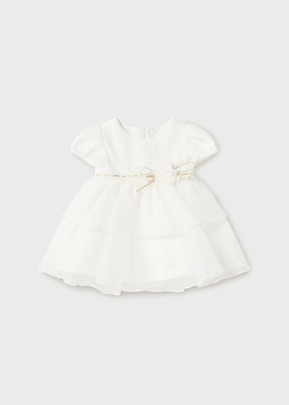 Vestido con mangas cortas para recién nacida. Cierre invisible en su espalda para facilitar la puesta de la prenda. Diseño en terciopelo. Modelo perteneciente a nuestra línea más elegante y exclusiva pensada para vestir a los más pequeños en las ocasiones más especiales.
